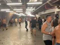 De las tantas imágenes que se compartieron, una de ellas muestra a un hombre tirado desnudo en el piso e inconsciente. En el barrio Sao Cristobal, un grupo de hinchas agredió a la Policía e, incluso, quiso destruir uno de sus vehículos.