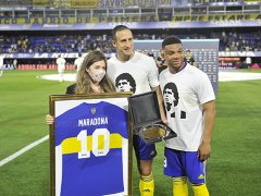 Los dos equipos salieron al campo de juego vistiendo camisetas blancas también con el rostro del "10". Y el capitán de Boca, Carlos Izquierdoz, junto con el colombiano Frank Fabra, le entregaron una camiseta y una plaqueta recordatoria a Dalma Maradona, la hija mayor del astro, la que solía acompañarlo a los partidos.