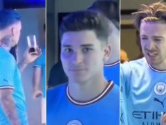 El delantero argentino les convidó un vaso del tradicional trago cordobés al arquero Ederson y al volante ofensivo Jack Grealish. Las reacciones de los futbolistas, en medio de los festejos del campeonato de liga inglesa.