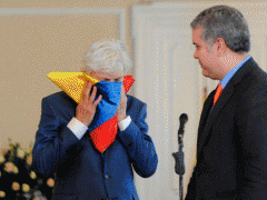 El presidente de Colombia, Iván Duque, entregó este lunes al entrenador argentino José Pekerman la bandera del país y una placa recordatoria por su trabajo como seleccionador, especialmente en los mundiales de Brasil y Rusia.