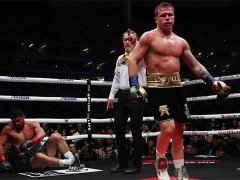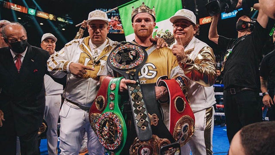 Ante más de 50.000 espectadores en el estadio de Guadalajara, de donde Álvarez es originario, el boxeador de 32 años dominó toda la pelea y conectó varios golpes que dejaron el rostro de su retador lleno de sangre.