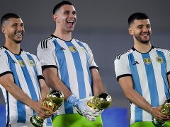 En la fiesta de los campeones, el arquero Emiliano "Dibu" Martínez recreó junto a sus compañeros Guido Rodríguez, Gerómino Rulli, Germán Pezzella y Marcos Acuña su icónica celebración en las finales de la Copa América y del Mundial Qatar 2022 con sus trofeos, pero ahora en el Monumental.