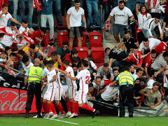 El festejo del primer tanto del argentino en el 3-1 del Sevilla al Eibar (luego marcó otro) fue accidentado: la valla de contención de una de las plateas se vino abajo y los hinchas, al suelo. No hubo heridos graves.