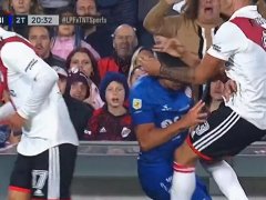 Esa situación generó una gresca entre ambos equipos que contó con una serie de empujones varios jugadores de ambos equipos siendo amonestados.