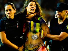 Durante un minuto, y tal como suele ocurrir en partidos de Europa, la señorita se paseó por el campo sin que la policía atinara a nada, ya sin la prenda y en ropa interior. Un efectivo policial atinó tímidamente a perseguirla, y enseguida fueron cuatro los policías abocados a la tarde de llevársela.