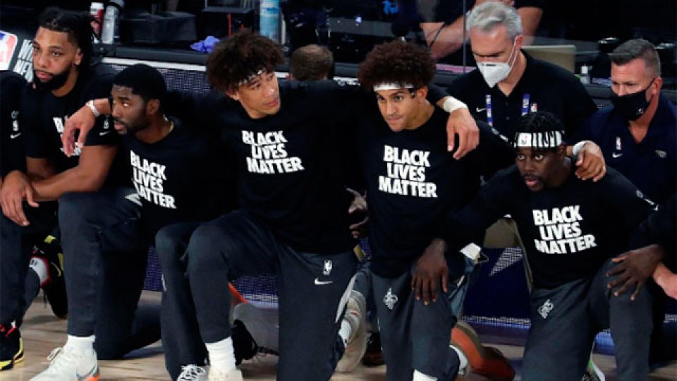 Los jugadores, con los brazos entrelazados, portaban camisetas negras con el lema 'Black Lives Matter' (La vida de las personas negras importa), que también está grabado en el centro de la cancha del complejo deportivo de Disney World (Orlando). El gesto se convirtió en uno de los símbolos de las masivas manifestaciones por la igualdad racial y el fin de la brutalidad policial en Estados Unidos y otros países.