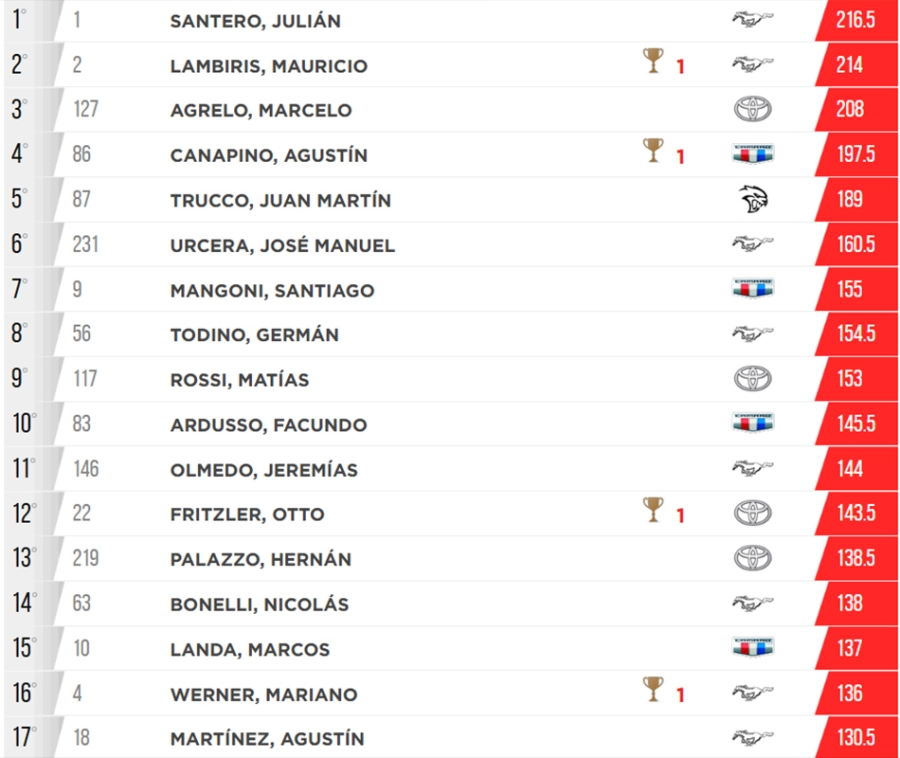La tabla está liderada por Santero (216,5), Lambiris (214), Marcelo Agrelo (208), Canapino (197,5) y Juan Martín Trucco (189). Más abajo, el último clasificado hoy sería Fritzler (143,5), con Werner apenas 7,5 puntos por detrás. Bonelli, por su parte, quedó 14° con 138 unidades.