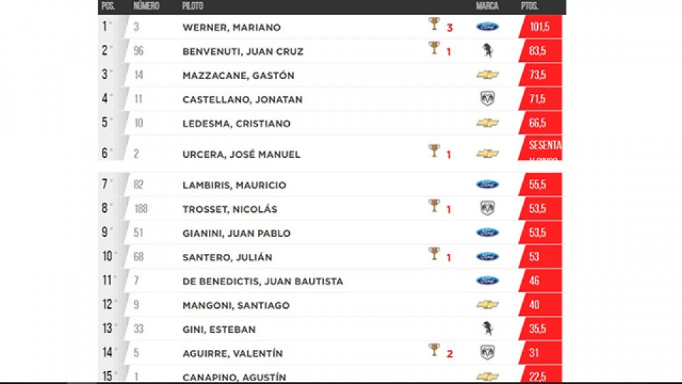José Manuel Urcera, quien tiene el triunfo, pero en El Villicum no contó con un buen funcionamiento del Chevrolet, está a 36.50 puntos de Werner, cuando habrá en juego 70.50.