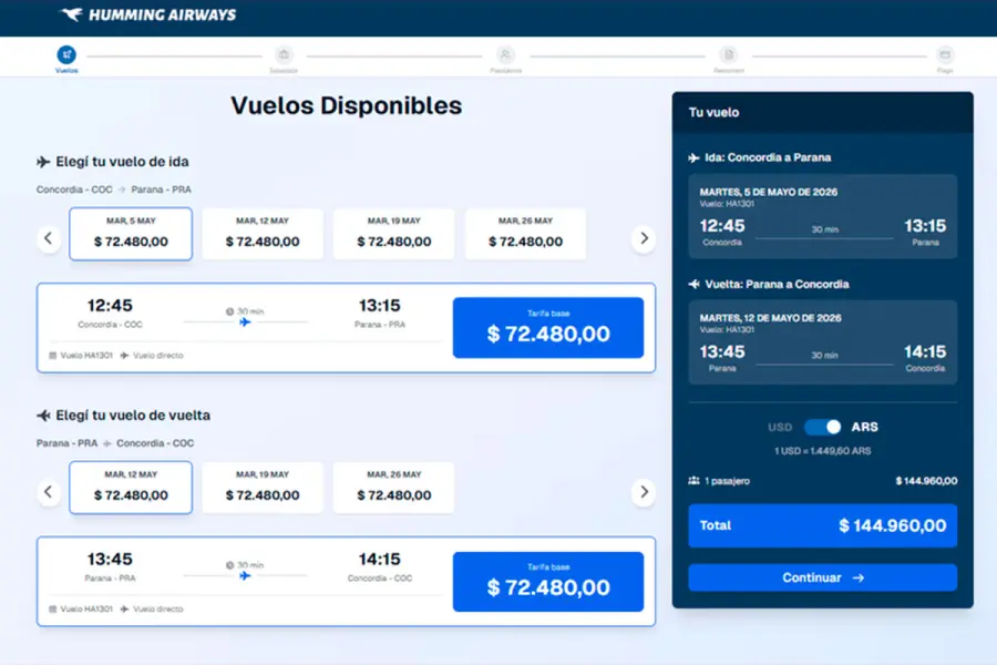 El regreso de vuelos entre Concordia y Paraná fue anunciado tras la aparición de la ruta en el sistema de reservas de la empresa Humming Airways, lo que generó expectativas sobre la recuperación de la conectividad aérea dentro de la provincia. Según se informó, los servicios comenzarían el próximo 5 de mayo con frecuencias semanales.