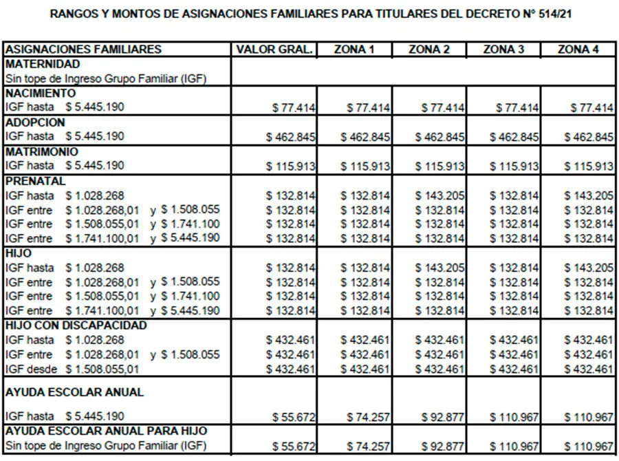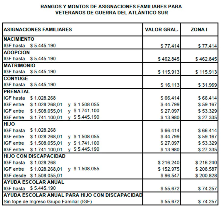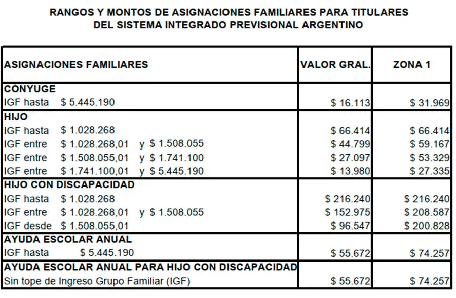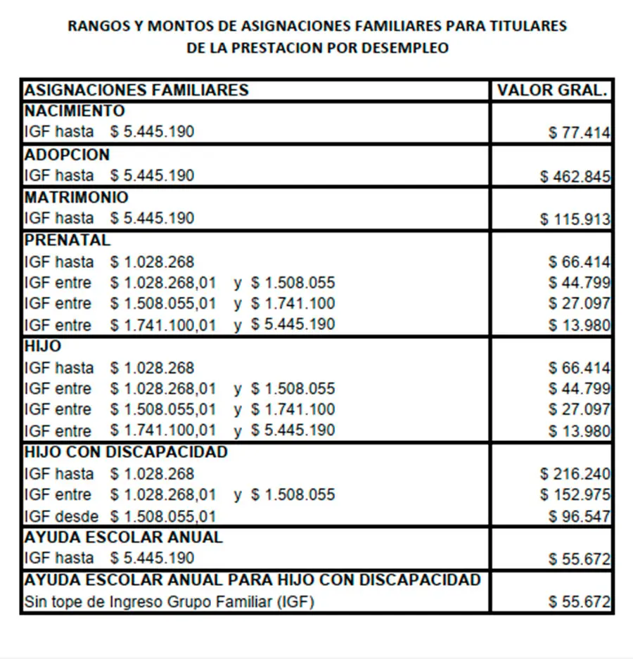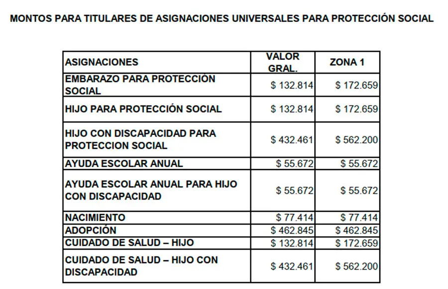 En tanto, la Asignación por Nacimiento será de $ 77.414, la Asignación por Adopción aumentará a $ 462.845, la Asignación por Matrimonio trepará $ 115.913, siempre que el Ingreso General Familiar (IGF) no supere los $ 5.445.190. La asignación Prenatal escalará $ 66.414 para los sectores que perciban menores haberes, con variaciones basadas en el ingreso familiar, descendiendo hasta $ 13.980 según el rango arriba explicitado.