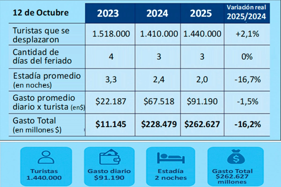 El fin de semana largo por el Día del Respeto a la Diversidad Cultural dejó un saldo positivo para el turismo interno argentino. De acuerdo con el relevamiento de la Confederación Argentina de la Mediana Empresa (CAME), se desplazaron 1.440.000 turistas por distintos puntos del país, lo que representa un 2,1% más que en el mismo feriado de 2024.