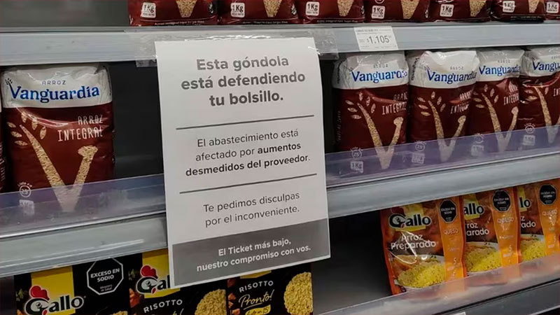 “El abastecimiento está afectado por aumentos desmedidos del proveedor. Te pedimos disculpas por el inconveniente”, completa el cartel de la cadena francesa que tiene 650 locales en todo el país. Por estas horas se vio el cartel en góndolas de aceite y arroz, por ejemplo.