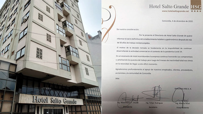 La pandemia se cobró una nueva víctima en el sector hotelero. El directorio del Hotel Salto Grande informó el cierre definitivo después de más de 50 años. La Asociación Hotelera y Gastronómica de Concordia lamentó la situación.