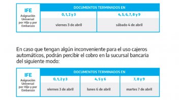 En tanto, a partir del sábado 4 de abril y en el curso del fin de semana, "la totalidad de los beneficiarios de AUH y AUE (con todas las terminaciones de documento) tendrá acreditado el IFE de 10.000 pesos en sus cuentas", precisaron.