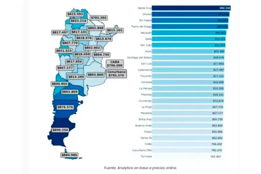 Según los datos del informe, Santa Cruz encabezó el ranking como la provincia más cara, con un gasto total de $890.350 para llenar el changuito. Le siguieron Chubut, con $876.576; Río Negro, con $863.809; Tierra del Fuego, con $860.986; y Neuquén, con $840.602.