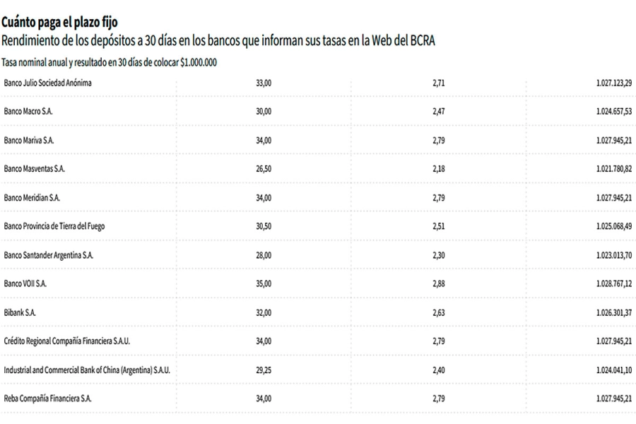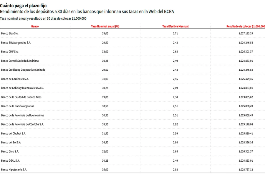 Rendimiento de un plazo fijo de $1 millón según cada banco. Durante los últimos días, la mayoría de los bancos mantuvieron sin cambios sus tasas nominales anuales (TNA) para depósitos a 30 días en pesos. Solo una entidad realizó un ajuste a la baja. Este panorama consolidó una marcada dispersión entre las ofertas más conservadoras y las más agresivas del sistema financiero argentino.