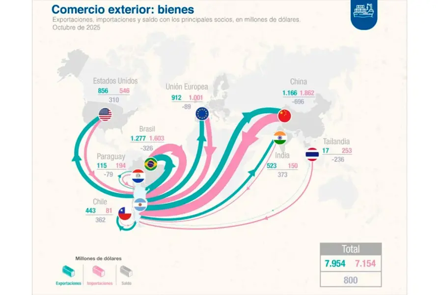 En el acumulado de los diez meses del año, las exportaciones alcanzaron los US$71.487 millones (suba de 8,1% contra mismo período del 2024), las importaciones los US$64.641 millones (suba de 28,9%) y un saldo total por US$6.846 millones.