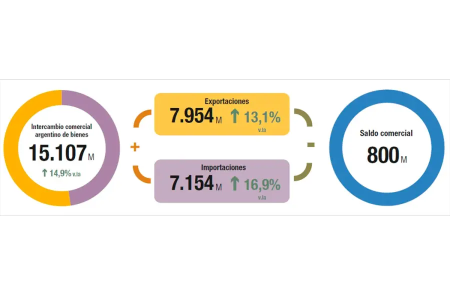En cuanto a las importaciones, subieron 16,9% y totalizaron los US$7.154 millones (US$1.033 millones adicionales). Este crecimiento se atribuyó a un aumento de 19,7% en las cantidades y a una disminución en los precios del 2,4%.