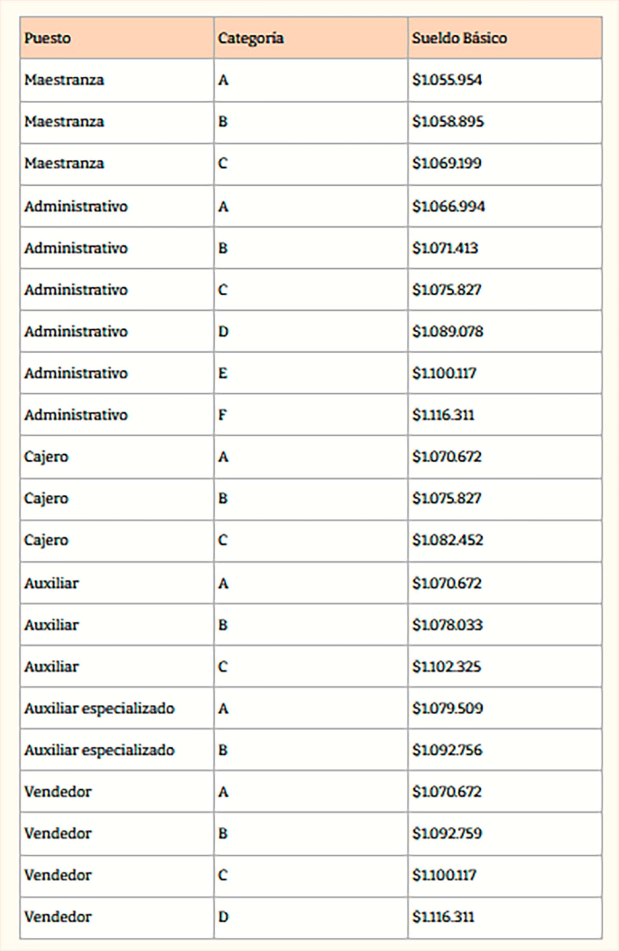 Los montos brutos para empleados de comercio por jornada completa sin adicionales para todas las categorías serían los siguientes: