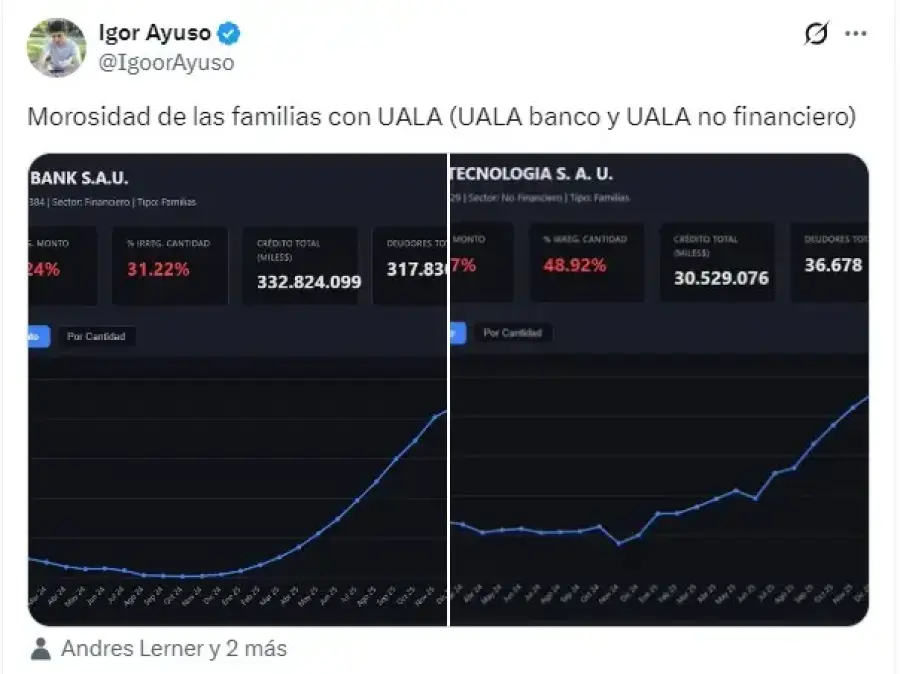 El posteo del usuario Igor Ayuso, quien basó su informe en datos del BCRA, en el segmento bancario de Ualá los impagos rondan el 43%. Pero en el negocio no financiero el número escala hasta un 63%. Ese dato encendió las alarmas en redes y parte del mercado.