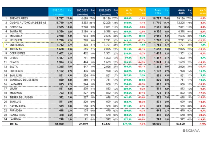 En este contexto, Entre Ríos se destacó dentro del escenario nacional. La provincia registró 1.752 patentamientos en enero de 2026, lo que representó una participación del 2,7% del total nacional.
