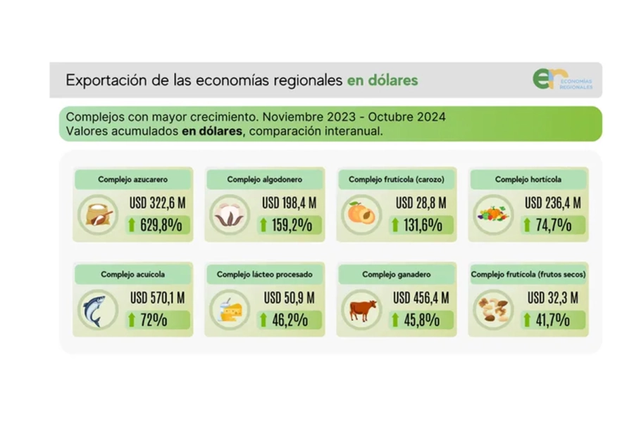 De acuerdo a un informe privado, el mes de octubre reflejó un fuerte incremento en las exportaciones de las economías regionales del 29,3% en dólares y 23,4% en toneladas, lo que representa una suba interanual de us1.990,3 millones en el total exportado y de 1,3 millones de toneladas en el volumen comercializado. Con este incremento, las exportaciones regionales alcanzaron los u$s8.777 millones exportados en el período noviembre 2023-octubre 2024, habiendo importado u$s914 millones, lo que arroja un superávit comercial de u$s7.863 millones.