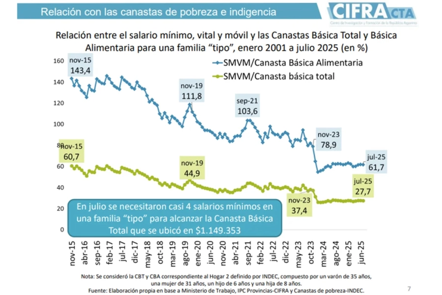 En esa línea, el reporte expuso que “la pérdida sufrida durante este gobierno se acumula con retrocesos previos, por lo que el salario mínimo se ubicó en agosto de 2025 en un nivel real que resulta 43,4% más bajo que en noviembre de 2019, al final del gobierno de Cambiemos y 56,7% menor que noviembre de 2015”.
