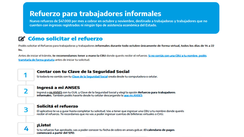 Los refuerzos, que se pagarán uno en octubre y otro en noviembre, están destinados a trabajadores informales de entre 18 y 64 años de edad que no cuenten con ingresos registrados y que no perciban asistencia económica del Estado, como la Asignación Universal por Hijo (AUH), las becas Progresar o el Potenciar Trabajo.