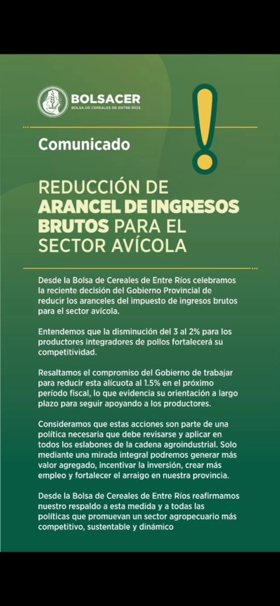 La Bolsa de Cereales de Entre Ríos manifestó su respaldo a la decisión del Gobierno Provincial de reducir la alícuota del impuesto a los Ingresos Brutos para el sector avícola, que pasará del 3% al 2%.
