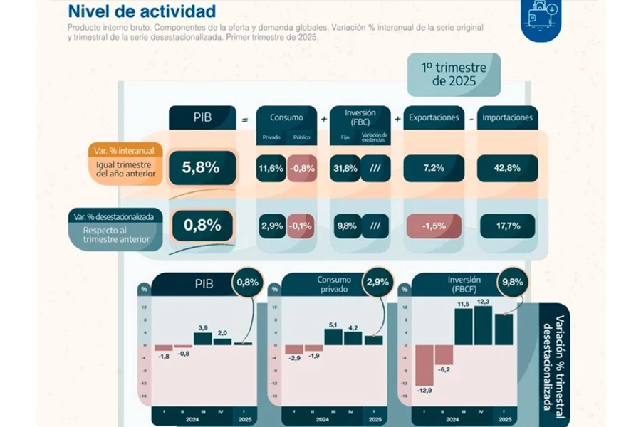Indec: la economía creció 5,8% en el primer trimestre de 2025. El Instituto Nacional de Estadísticas y Censos (INDEC) informó que el Producto Interno Bruto (PIB) registró un crecimiento del 5,8% en el primer trimestre del año. De manera mensual, aumentó un 0,8% en comparación con el último trimestre del 2024.