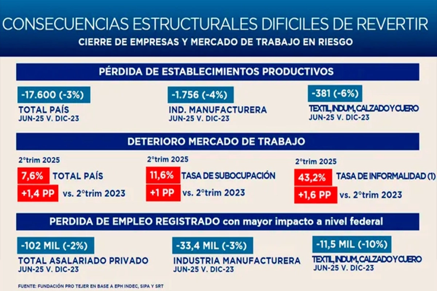 La crisis que atraviesa la industria textil argentina es cada vez más dramática. Según el último informe de la Fundación Pro Tejer, durante los últimos 18 meses se cerraron casi 400 empresas y se perdieron más de 12 mil empleos en el sector. Los empresarios textiles apuntan a diversos factores que complican aún más la situación, entre ellos, la desactualización del dólar, las políticas impositivas y la competencia desleal de productos importados, especialmente los que provienen de plataformas de venta como Shein.