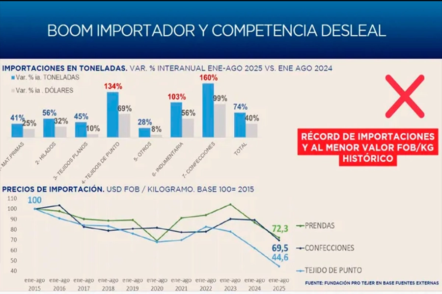 Luciano Galfione, presidente de la Fundación Pro Tejer, alertó en una entrevista con C5N que los números reflejan una situación que ya se preveía: "Los índices del año pasado se han profundizado y advertimos que esto iba a pasar", expresó el dirigente. De acuerdo con el informe de la fundación, entre enero y agosto de 2024, las importaciones en la industria textil crecieron un 40% en dólares y un 74% en volumen de toneladas, lo que incrementó aún más la competencia desleal.