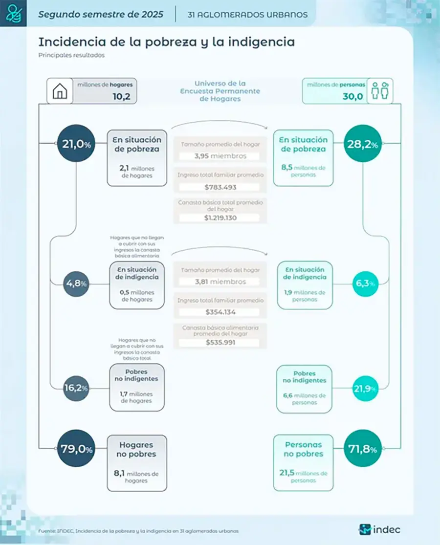 El Instituto Nacional de Estadística y Censos (Indec) dio a conocer que, en el segundo semestre de 2025, la pobreza se ubicó en 28,2% y la indigencia en 6,3% en los principales centros urbanos del país.