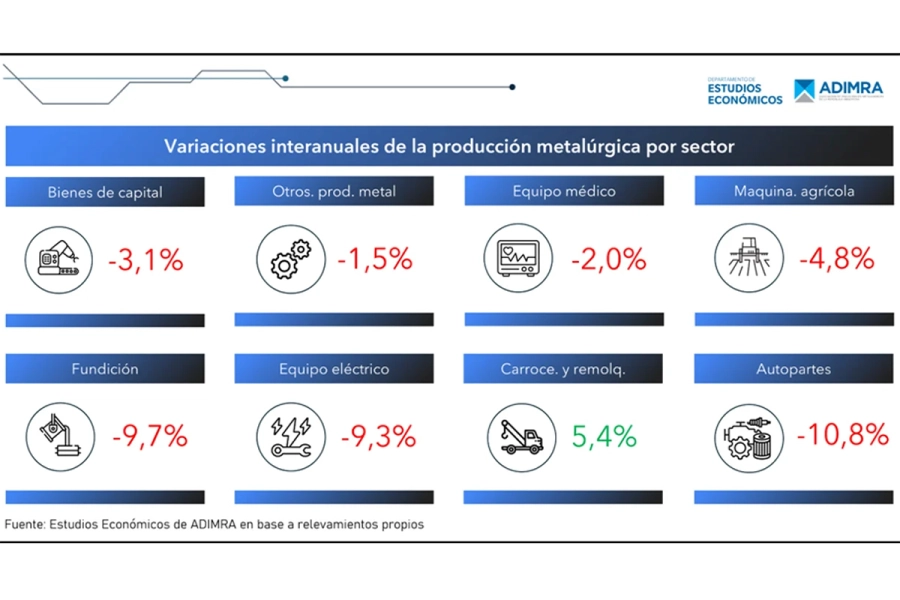La actividad metalúrgica registró en septiembre una caída del 5,2% interanual y del 1,1% respecto al mes anterior, según un informe del Departamento de Estudios Económicos de la Asociación de Industriales Metalúrgicos de la República Argentina (ADIMRA).