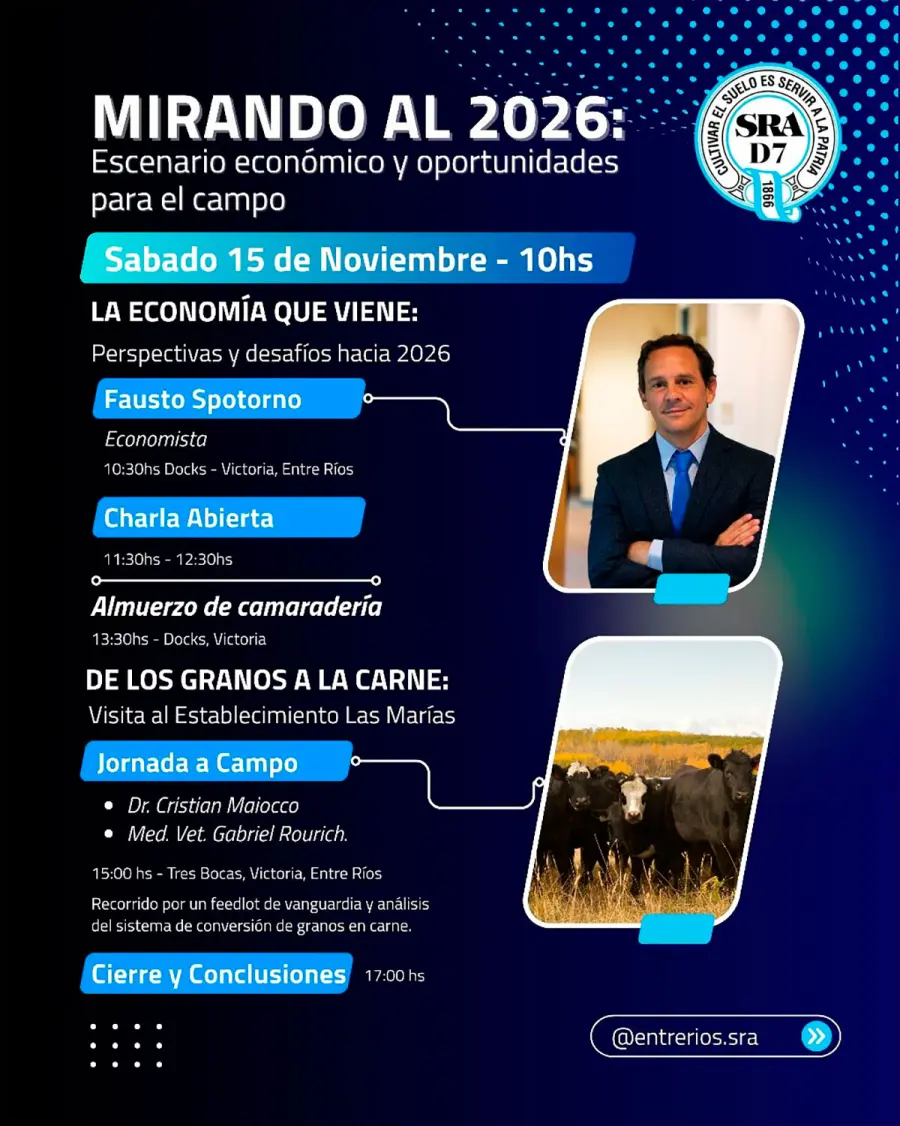 La Sociedad Rural Argentina – Distrito 7, encabezada por su director Juan Diego Etchevehere, convocó a una jornada abierta en la ciudad de Victoria destinada a productores, técnicos y dirigentes del sector agropecuario. El encuentro, que se desarrollará este sábado 15 de noviembre desde las 10:00 en el salón Docks, propone una mañana de análisis, intercambio y experiencias de campo.