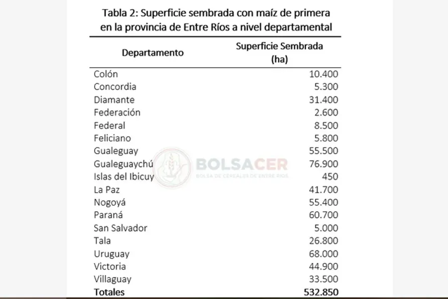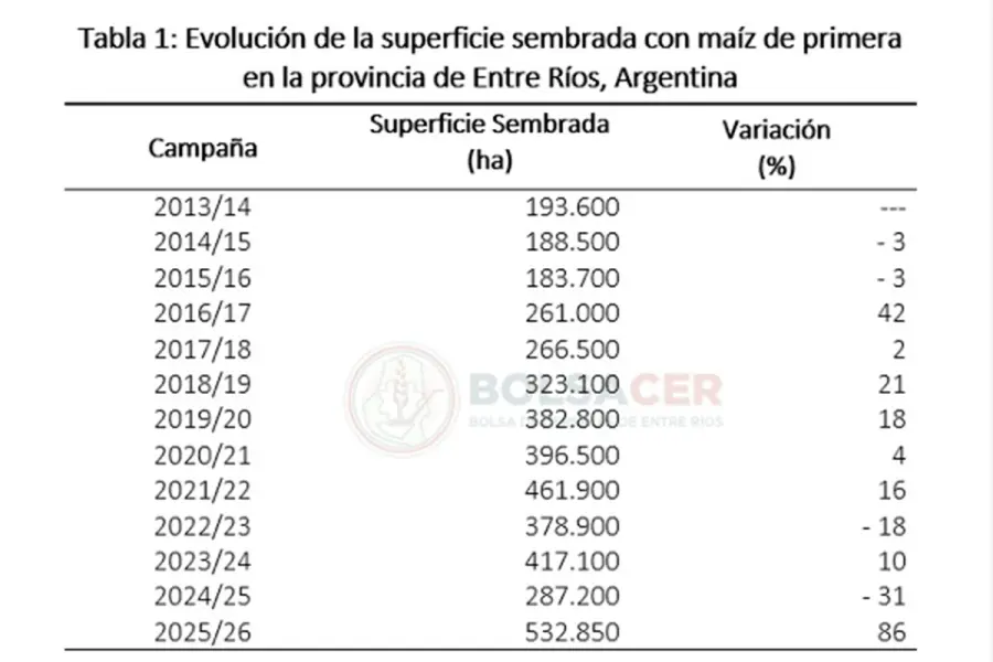 Según un informe de la Bolsa de Cereales de Entre Ríos, en el ciclo 2025/26, la superficie sembrada con maíz de primera en Entre Ríos alcanzó un total de 532.850 hectáreas (ha), lo que representa un incremento interanual del 86%. Este crecimiento equivale a una expansión de 245.650 hectáreas en comparación con la campaña previa, marcando una recuperación destacada luego de la fuerte retracción registrada en 2024/25.