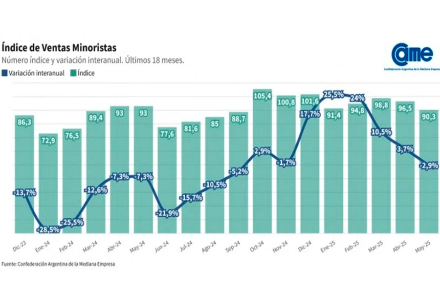 Las ventas minoristas de las pymes retrocedieron 2,9% interanual en mayo, volviendo a caer después de cinco meses consecutivos de crecimiento, y bajaron 0,7% respecto a abril, de acuerdo a un relevamiento elaborado por la Confederación Argentina de la Mediana Empresa (CAME).