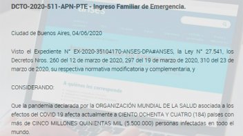 El decreto 310 creó el IFE "como una prestación monetaria no contributiva de carácter excepcional, prevista para compensar la pérdida o grave disminución de ingresos de personas afectadas por la situación de emergencia sanitaria".