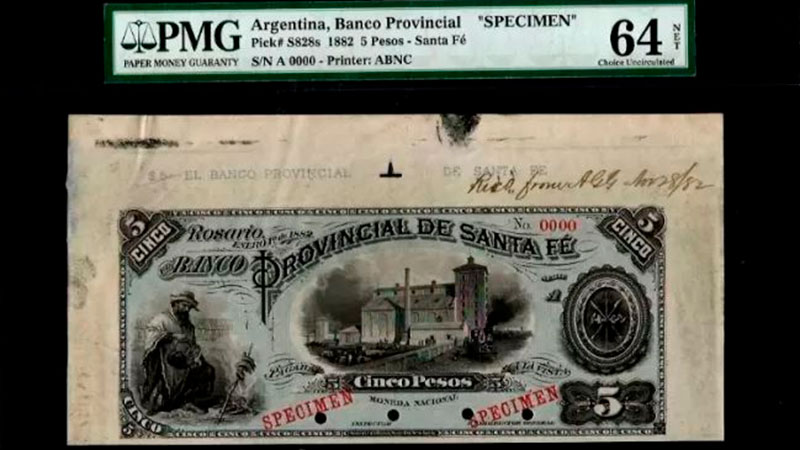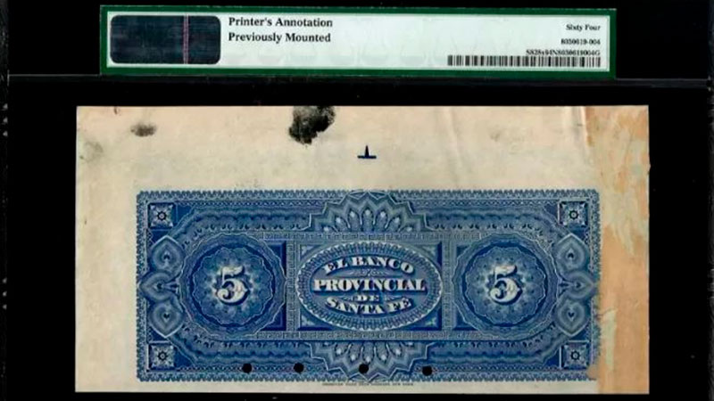 Es el caso del billete de $ 5 que fue emitido por el Banco Provincial de Santa Fe en 1882. Este ejemplar histórico tiene la figura de un gaucho en el anverso y el valor nominal en el reverso.