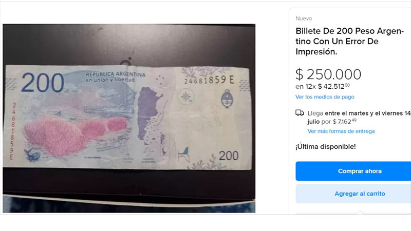 Sin embargo, existe un error en la impresión que eleva su valor hasta los $ 250.000 según los ofertantes de Mercado Libre.