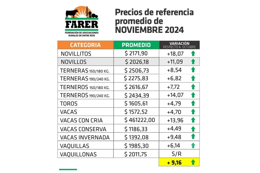 La Federación de Asociaciones Rurales de Entre Ríos (FARER) dio a conocer este lunes los valores promedios arrojados por los distintos remates de hacienda en pie desarrollados durante noviembre en las instalaciones ferias de las rurales entrerrianas.