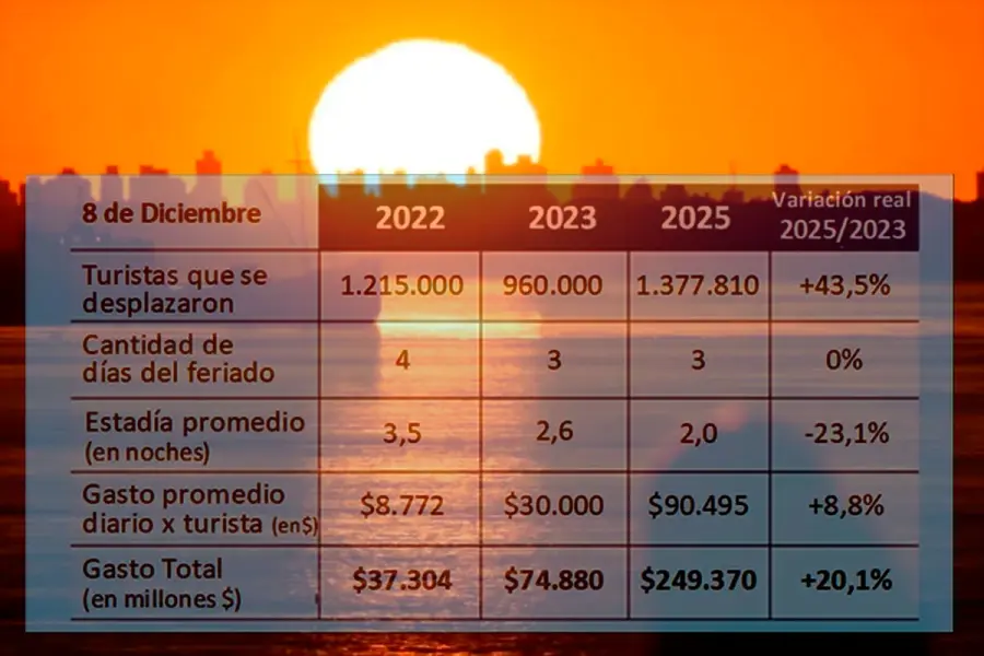 De acuerdo con el relevamiento de la Confederación Argentina de la Mediana Empresa (CAME), durante el fin de semana largo por el Día de la Inmaculada Concepción se desplazaron 1.377.810 turistas por la Argentina, un 43,5% más que en el mismo feriado de 2023 (en 2024 no hubo feriado). La fecha volvió a consolidarse como uno de los momentos de movilidad turística previos al verano.