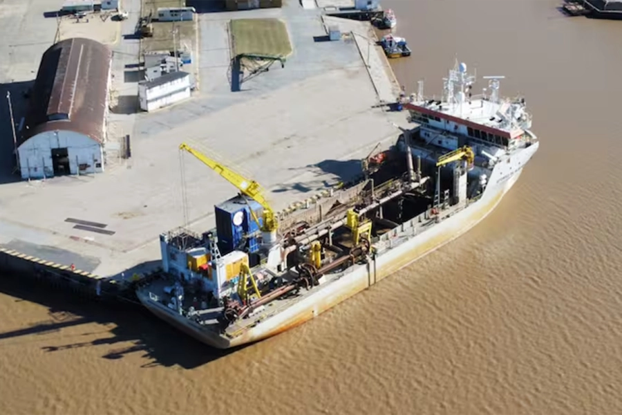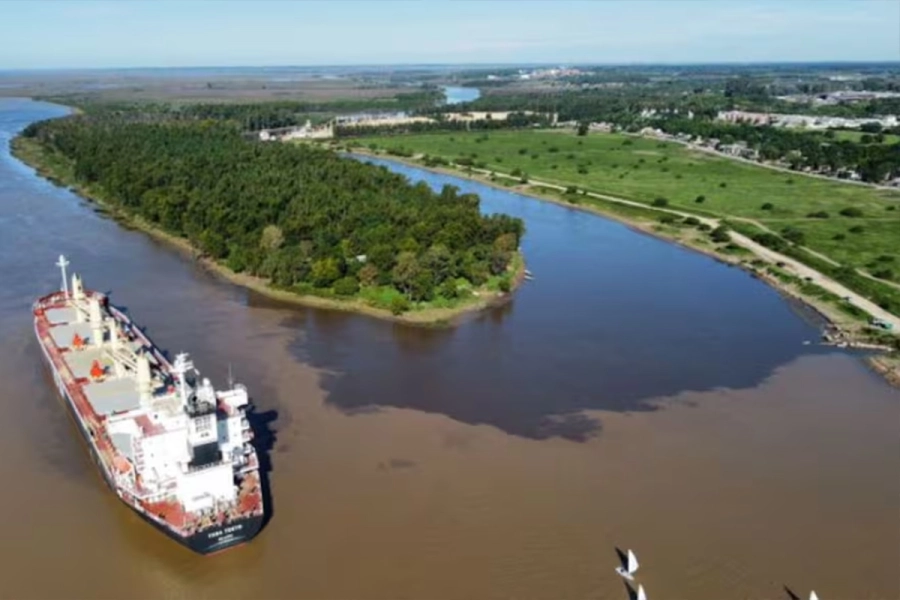 Incluso, este fenómeno del “agua más oscura” también es visible sin imágenes satelitales. Un dron sobrevoló el puerto y pudo captar la zona donde el buque se frenó. Con ellas, las autoridades brindaron soporte visual a las mediciones que realizaron para justificar su hipótesis sobre la sedimentación. Entonces, el río necesita volver a ser profundo. En consecuencia, las autoridades debaten cuánto deben dragarlo, cuánto se debe gastar en esa obra y cómo pagarlo. Mientras tanto, el tiempo corre, el barco sigue varado y el puerto bloqueado.