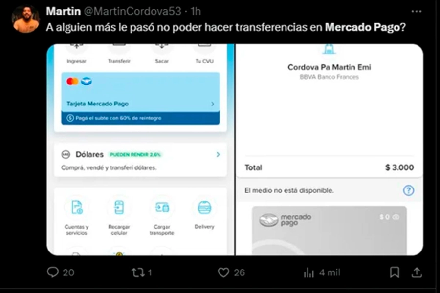 “¿A alguien más le pasa esto en @mercadopago HOY? No me deja transferirme el dinero ni elegir otro medio”, tuiteó un usuario, mientras otros cientos replicaban situaciones similares, lo que derivó en que Mercado Libre y Mercado Pago fueran tendencia en X.