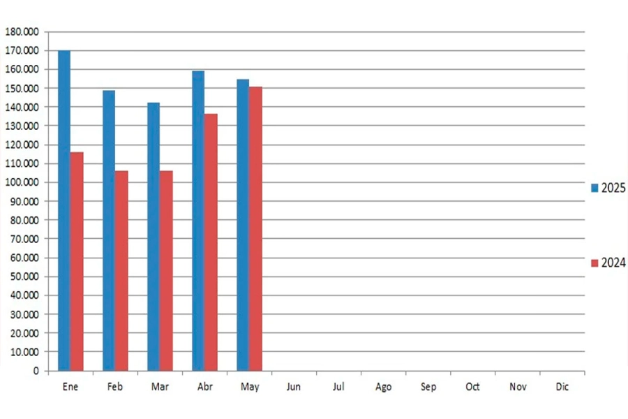 En el período enero-mayo 2025 se vendieron 775.213 unidades, lo que representó un aumento del 25,95% con respecto a igual período de 2024 (615.516 vehículos).