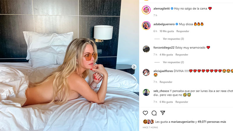 La modelo y panelista Alejandra Maglietti impactó con una serie de fotos. La rubia se mostró sin ropa, bajo las sábanas, y sólo con lentes de sol de color amarillo. “Hoy no salgo de la cama”, escribió.