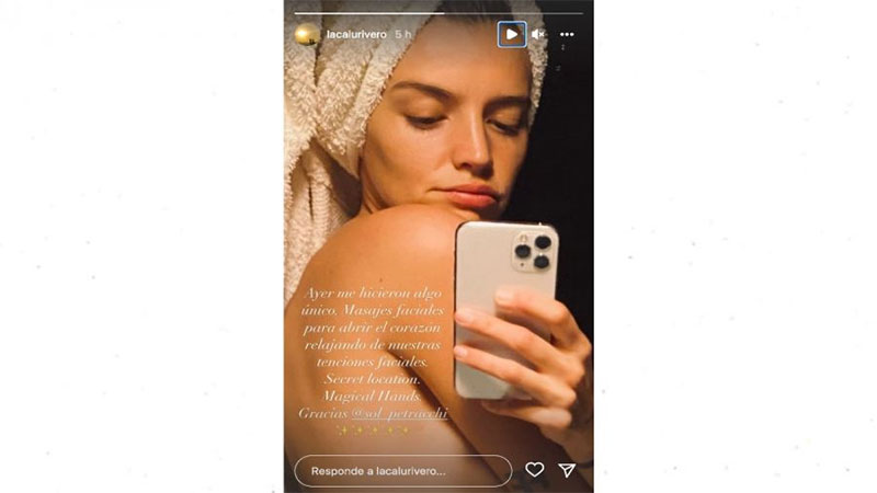 Asimismo, Rivero usó sus historias para agradecer por un servicio que recibió y para esto, la intérprete y modelo posó completamente desnuda frente a un espejo con una toalla en el cabello. "Ayer me hicieron algo único. Masajes faciales para abrir el corazón, relajando de nuestras tensiones faciales ", escribió Calu en la foto.