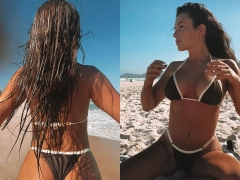 Desde Brasil, sentada sobre la arena y disfrutando del sol, la modelo posó en la playa con una microbikini de diseño bicolor en marrón chocolate con bordes en color crema.