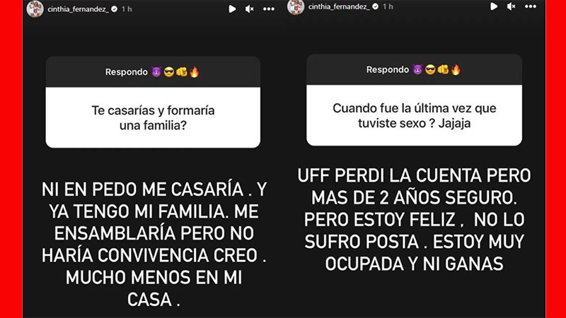 Cinthia Fernández sorprendió al revelar cuándo fue la última vez que tuvo relaciones sexuales. A través de una caja de preguntas de Instagram, sus seguidores pudieron hacerle todo tipo de consultas y ella no dudó en responderlas.