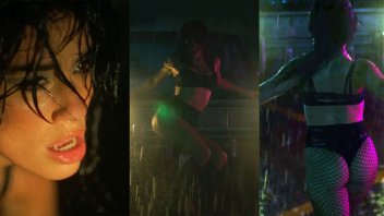 Bajo la lluvia, tal como dice la letra de la canción, la también actriz se mostró con un cigarrillo en la boca y un vestuario clásico y descontracturado: top blanco, chaqueta de cuero, jean azul recto y un cinturón a juego con la campera. El pelo suelto con ondas y flequillo recto completó el outfit, que dio paso a un segundo look con el que redobló la apuesta.